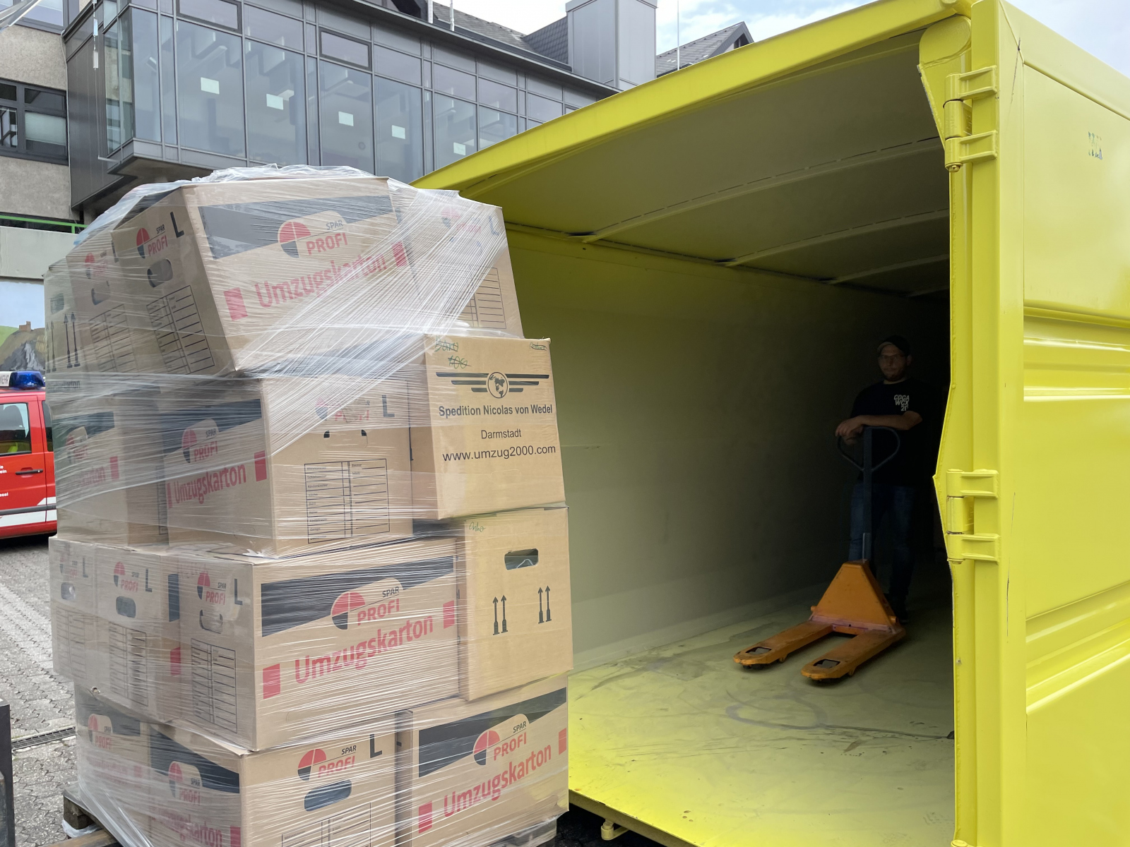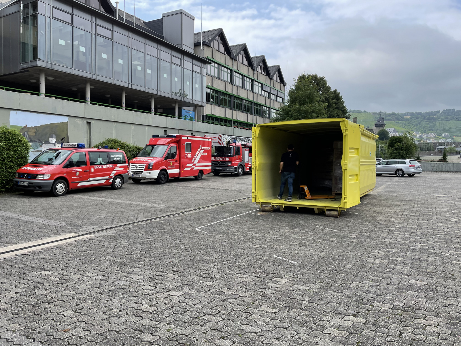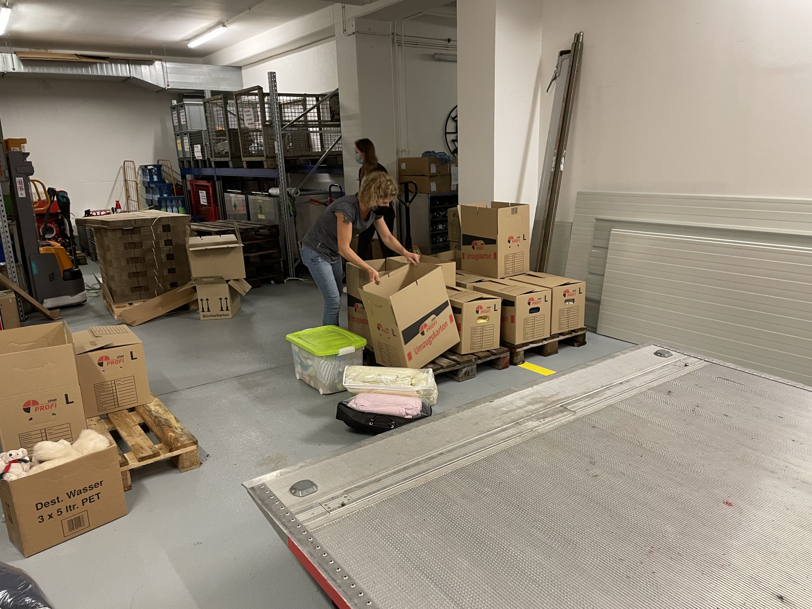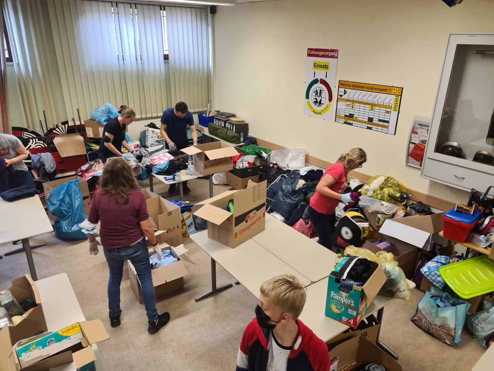 Es wurden nun im großen Stil Sortiertische aufgebaut, Paletten und Kartons besorgt und Lager- sowie Transportmöglichkeiten geschaffen. Bereits nach kürzester Zeit stand der erste 40m³-Container auf dem Schulhof der benachbarten Heuss-Adenauer Realschule, welcher sofort mit sortierten Sachspenden gepackt werden konnte. Weitere Paletten mit Spenden-Material wurden über Nacht im Gerätehaus gelagert. Hierzu wurden mehrere Einsatzfahrzeuge außerhalb des Gerätehauses untergebracht, um kurzfristig Lagerfläche zu schaffen. Die letzten Helfer waren bis in den späten Abend die Spenden am Sortieren.