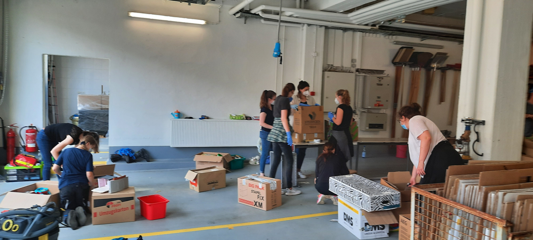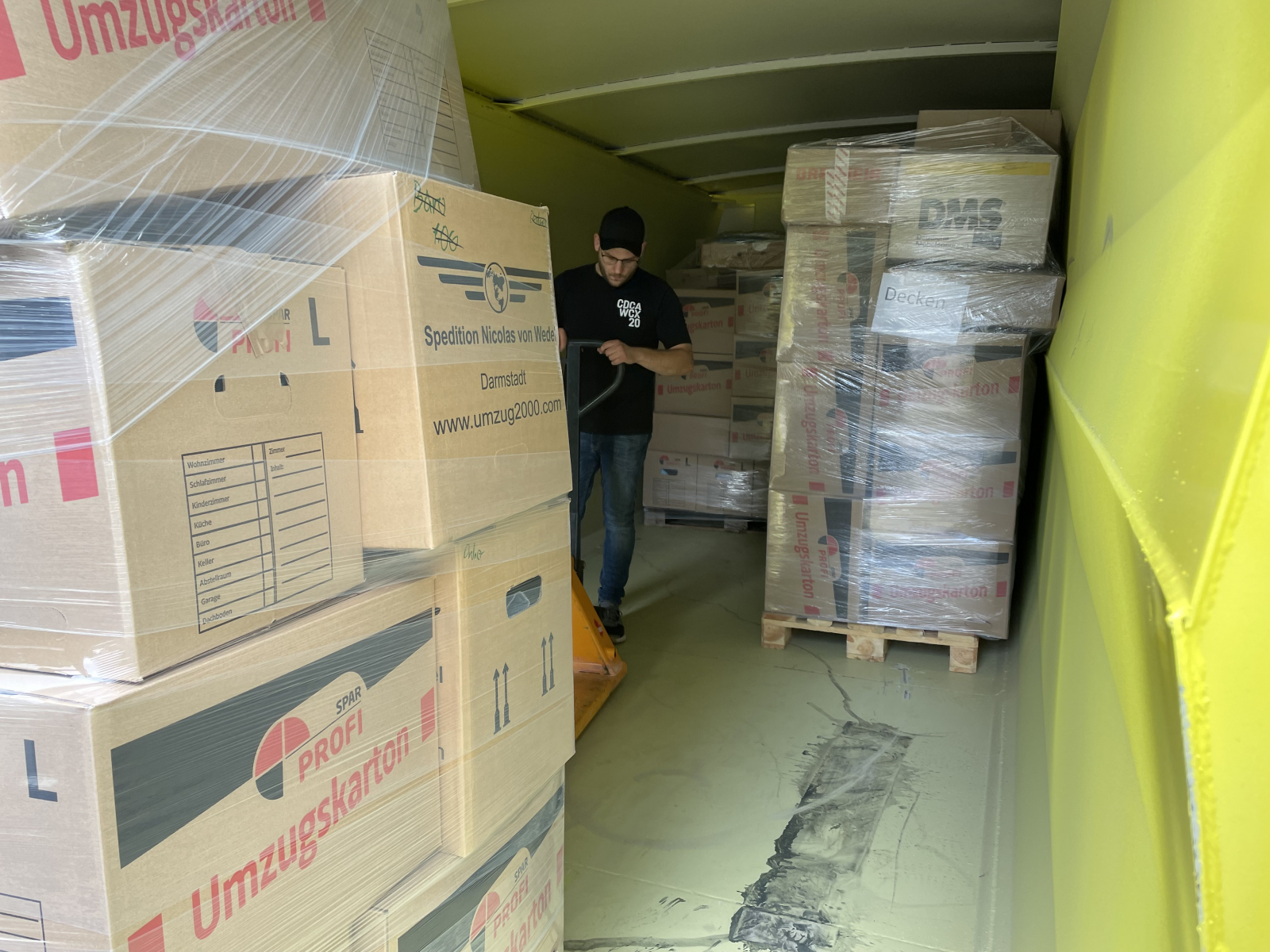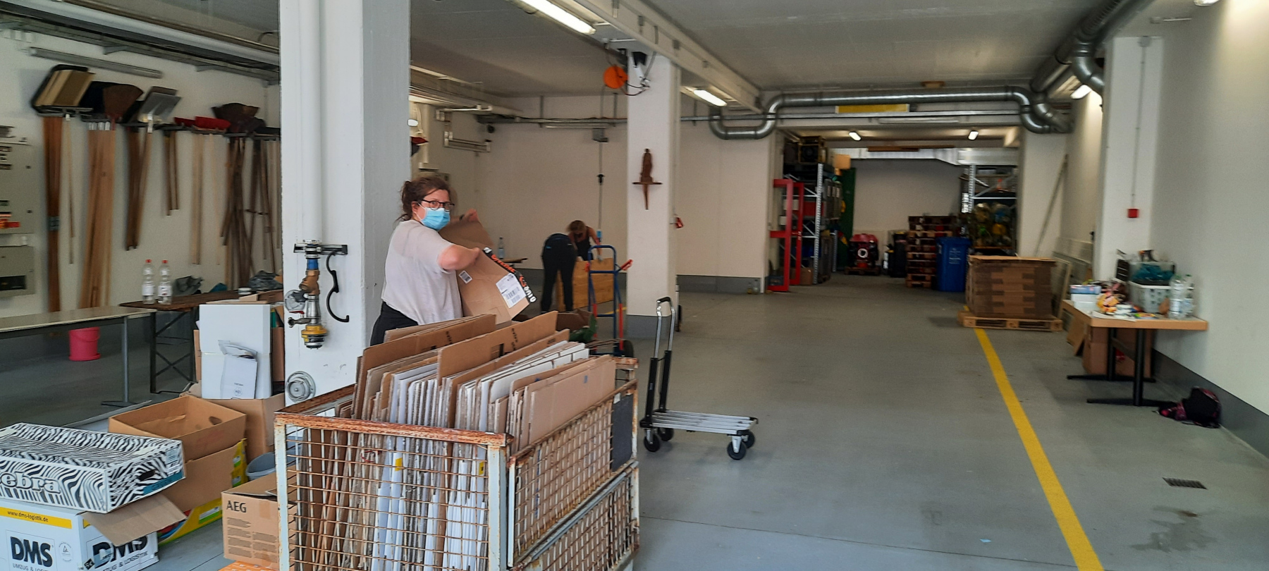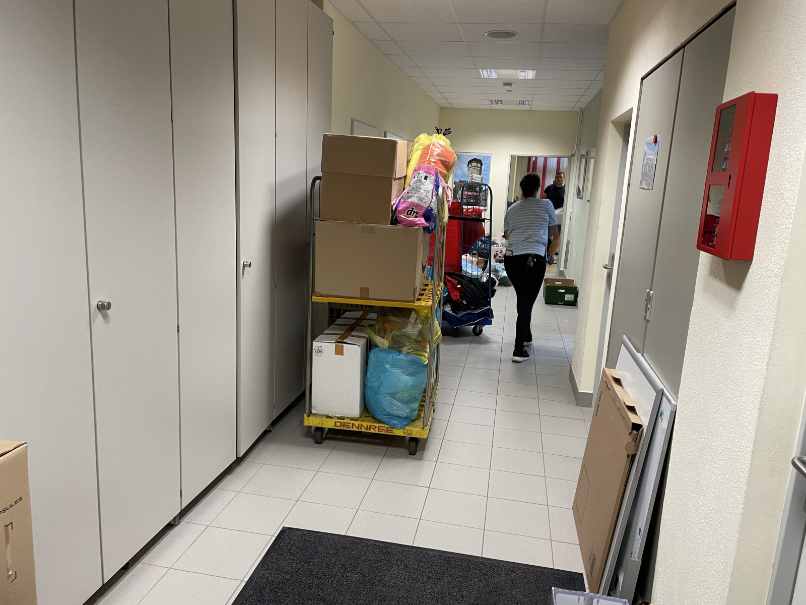 Es wurden nun im großen Stil Sortiertische aufgebaut, Paletten und Kartons besorgt und Lager- sowie Transportmöglichkeiten geschaffen. Bereits nach kürzester Zeit stand der erste 40m³-Container auf dem Schulhof der benachbarten Heuss-Adenauer Realschule, welcher sofort mit sortierten Sachspenden gepackt werden konnte. Weitere Paletten mit Spenden-Material wurden über Nacht im Gerätehaus gelagert. Hierzu wurden mehrere Einsatzfahrzeuge außerhalb des Gerätehauses untergebracht, um kurzfristig Lagerfläche zu schaffen. Die letzten Helfer waren bis in den späten Abend die Spenden am Sortieren.