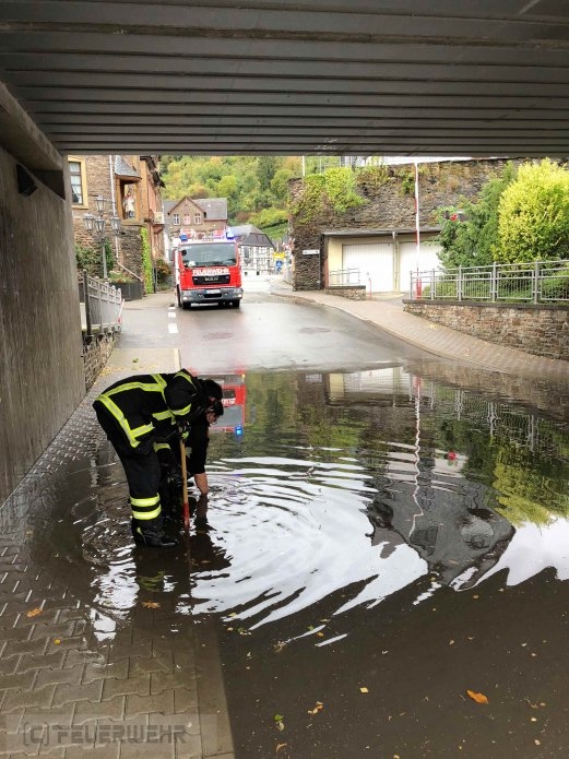 Durch das Sturmereignis am Sonntag, den 23. September setzten sich die Straßenabläufe der Bahn-Unterführung am Schaarplatz mit Laub und Schlamm zu. Durch den darauffolgenden Starkregen war die Ausfahrt mit Regenwasser vollgelaufen und verhinderte das passieren von Fahrzeugen. Durch das schnelle Eingreifen von Wehrführer Stiehl sowie zwei weiteren Kameraden konnten die Abläufe mittels Halligan-Tool und Feuerwehraxt geöffnet und gereinigt werden, wodurch ein rascher Ablauf des Oberflächenwassers ermöglicht wurde. Anschließend wurde die Straße gereinigt und somit die Verkehrssicherheit wieder hergestellt.